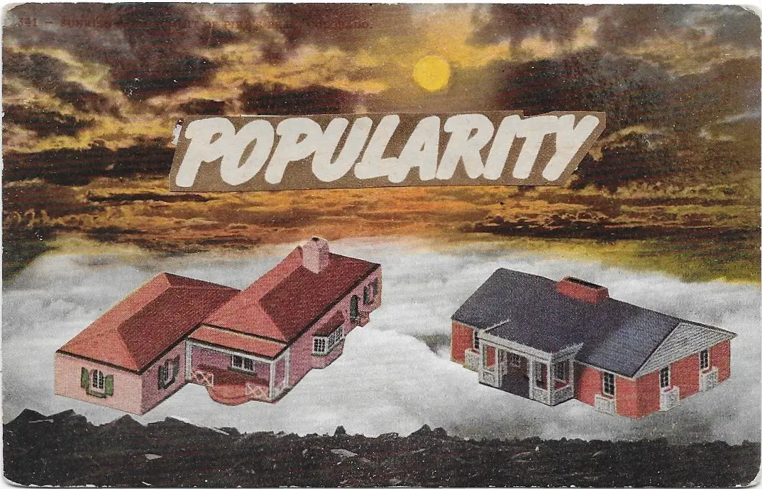 Sante’s dual engagement with found imagery and critical writing appears in Evidence (1992) and Folk Photography (2009), books that examine collections of vernacular photography with the same exacting attention she brings to her collages. Her own archive of American photo postcards—the subject of Folk Photography—directly informs her collage practice; several works in this exhibition incorporate printed postcards, whose damage and patina make them less desirable for traditional collectors but add value and visual interest for Sante. A series of imagined covers for science fiction books incorporates her grandparents’ lotto cards. Her broader collection of materials spans magazines and printed ephemera from the nineteenth century through the 1950s.