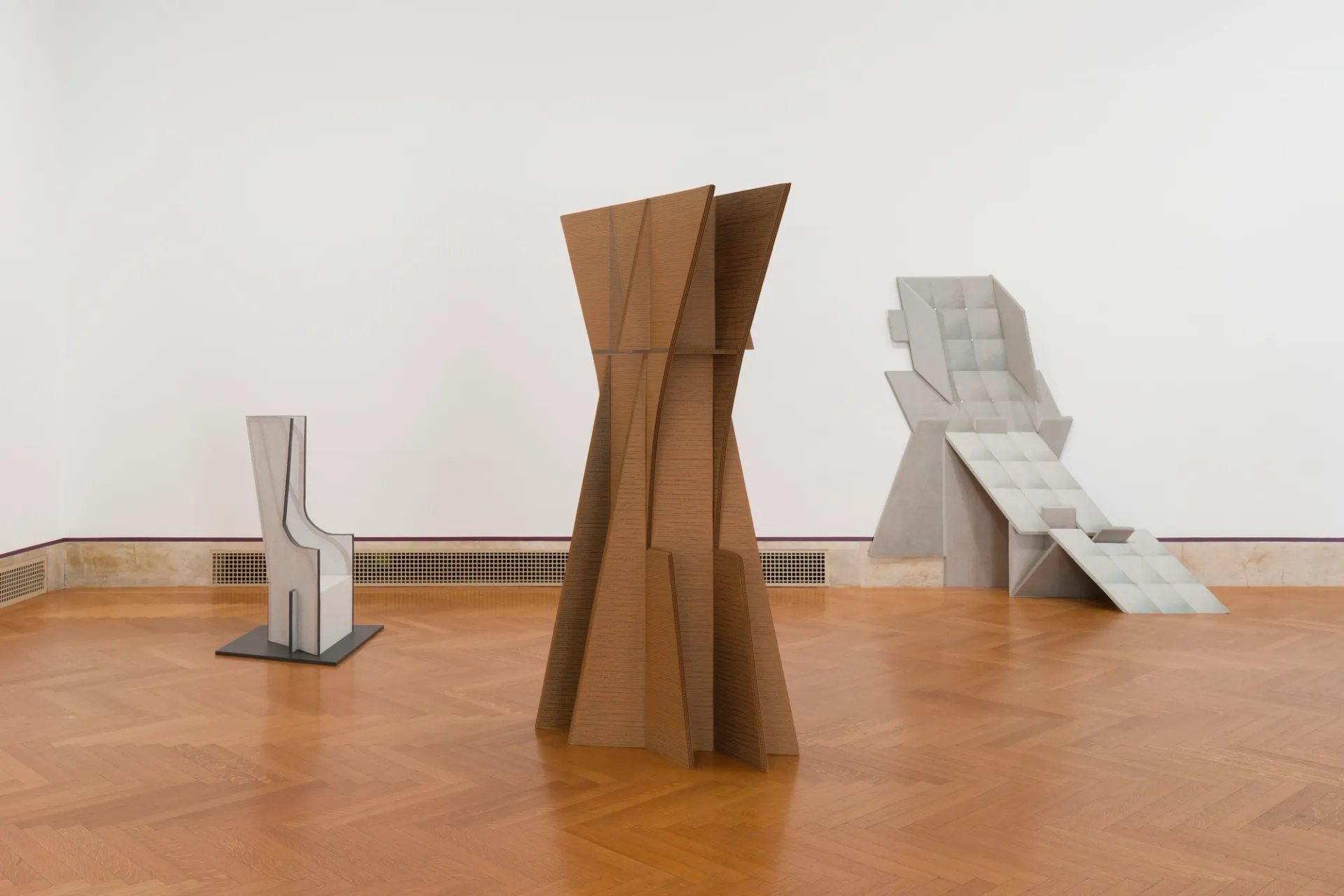 Her material vocabulary draws from the hardware store and the domestic realm—corrugated board, medium-density fiberboard, aluminum, brass, linoleum, and galvanized steel, alongside everyday fabrics like linen, leather, and mesh. Using a jigsaw, router, and other tools and innovative sculptural techniques, she painstakingly handcrafts each work, developing methods to meet the needs of different pieces and materials. Part of the transformation involves playful shifts of scale—her works always reference the body through clothing or architecture, “the subject of the body without the body,” as she puts it, but their proportions are often surprising. “Things happen when I construct the form that I can't anticipate,” she explains, describing how this distinctive process distances her sculptures from their sources.