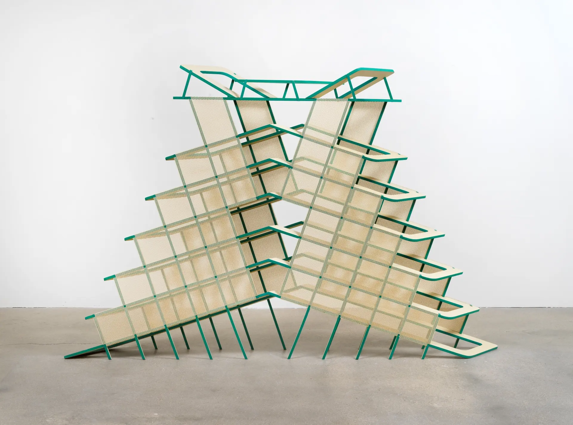 Working from photographs she has collected over decades, Simpson develops each piece through meticulous axonometric drawings on graph paper, using 45-degree angles to flatten three-dimensional forms before reconstituting them as sculptures that retain those same geometric distortions. Her drawing system has its roots in the spatial perspectives of medieval paintings, Persian miniatures, and Japanese scrolls, creating what she calls a “bird’s-eye view that results in a very immediate presence.”