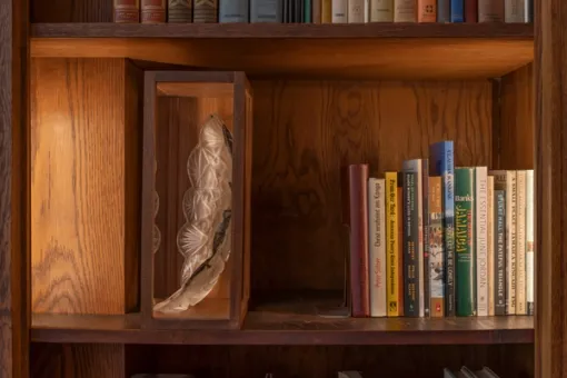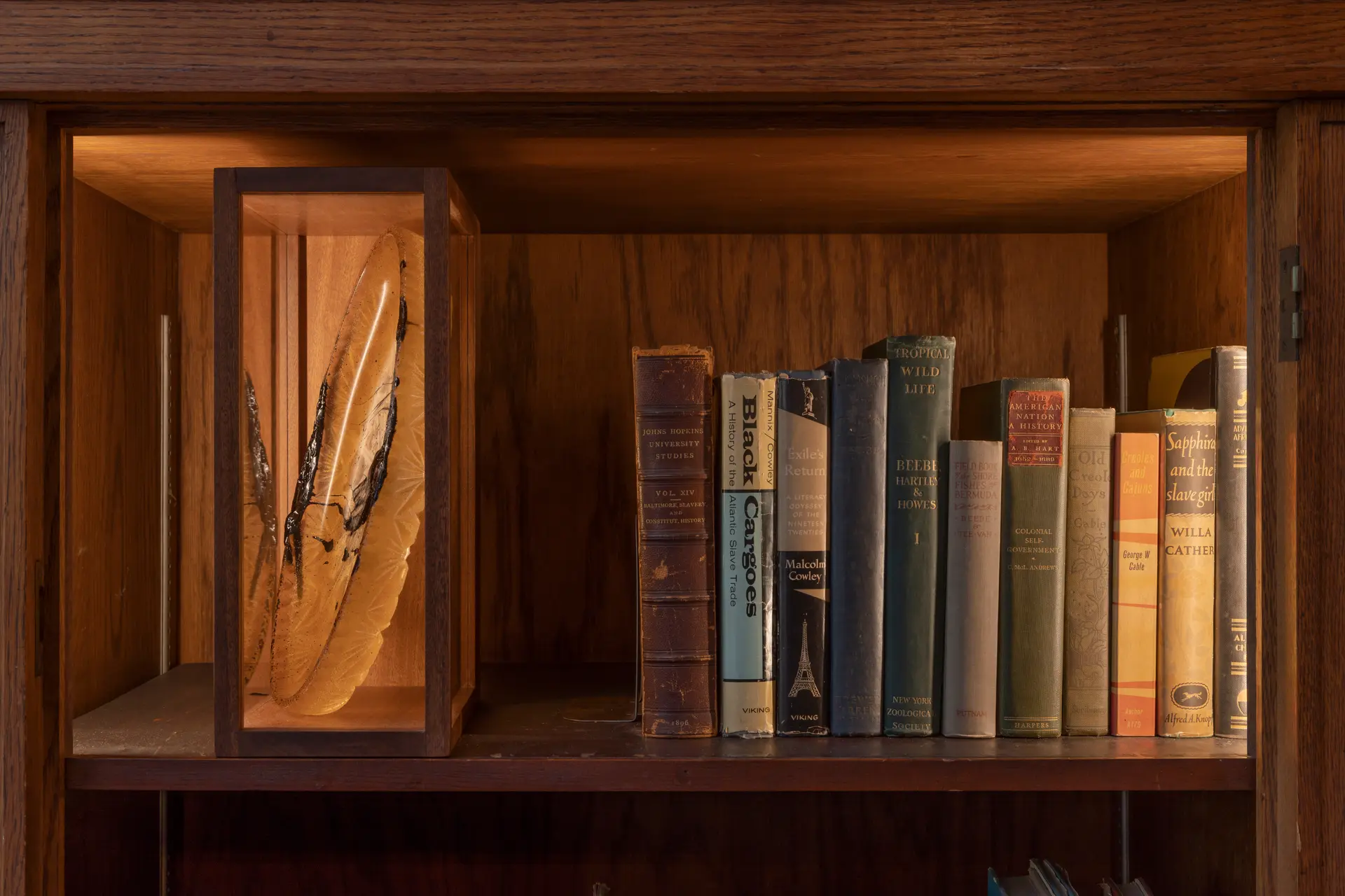 In recent years, Rhea Dillon (b. 1996; London, UK) has been thinking through Caribbean concepts of family and the histories that land can hold. In this exhibition, new works made with natural materials significant to Jamaica rest on wooden bookshelves or hang on the paneled walls as an intervention in the Library of the American Academy of Arts and Letters. With the sculptures, Dillon transforms a domestic object into a minimal form. Interested in the mutability of gesture, she constructed the sculptures with materials that resist cohesion, causing them to morph and decay over time. Likewise, a work on paper simultaneously suggests the stem of a leaf, a suture, or a route. This kind of slippage is fundamental to Dillon’s work.